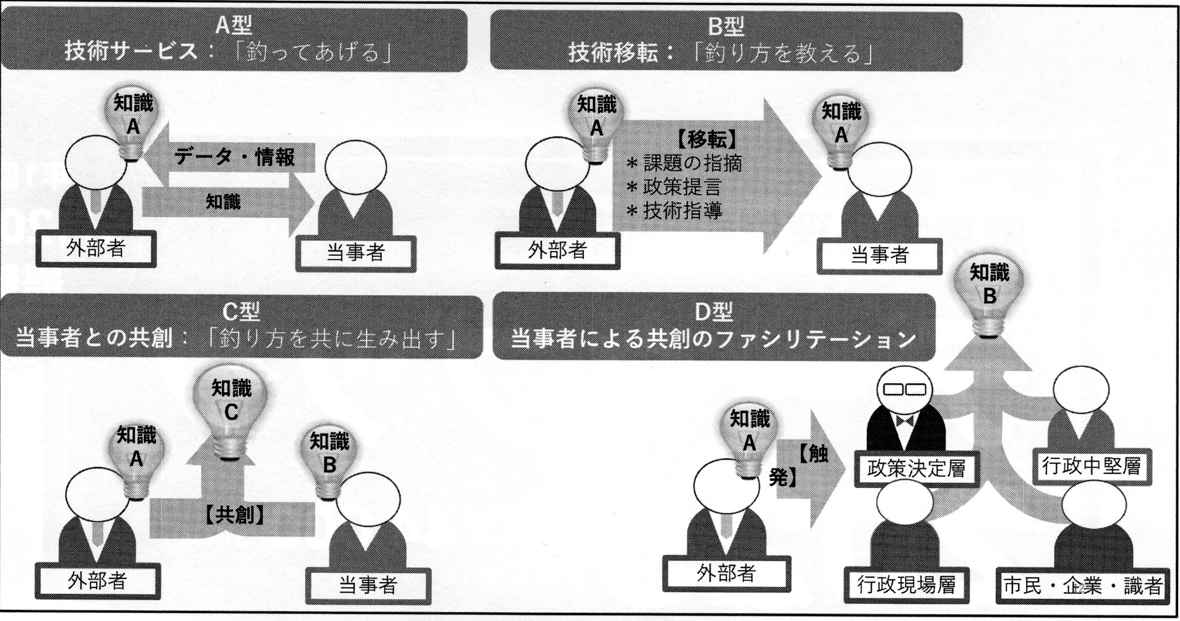 これはそこに石井さんのような外部者がどのように関与するか,日本でも自治体が地域おこしする際に,コンサルタントさんや大学の先生にお願いすることがあると思うのですが,そういった場合,外部から介入する人がどのように関わるか,ということですけれども,A型が技術を提供して課題を解決してあげるという古典的なパターンで,B型がこれは援助における古典的なパターンで,釣り方を教えてあげるという技術移転でございますが,このA型B型は今まで機能しなかったということで,C型で一緒になって作る。これは石井さんがやられたアプローチですね。あと,D型は当事者たちが作ることを横から側面的に助けてあげる,ということでございます。これは,特に日本の自治体では求められているインターベンションの方なんだろうと思います。